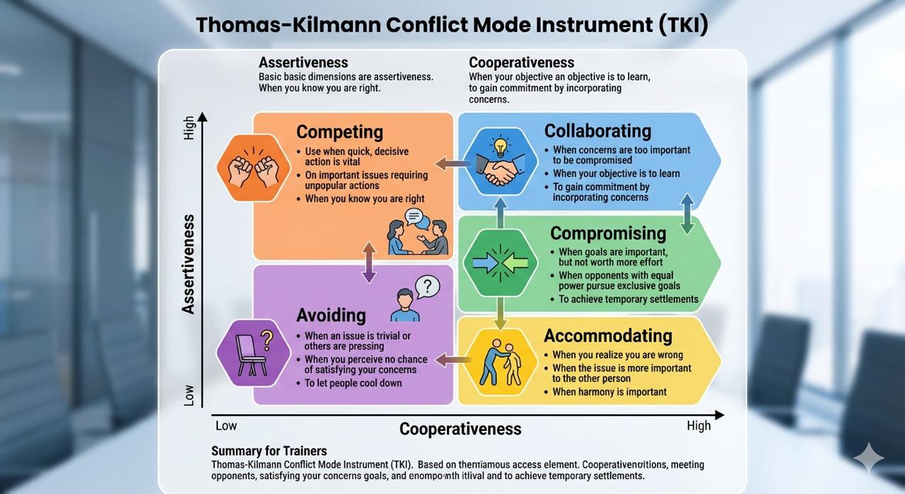 Based on these two dimensions, the TKI identifies five distinct "modes" or styles for responding to conflict. No single mode is "right" or "wrong"; rather, each is effective in specific situations.